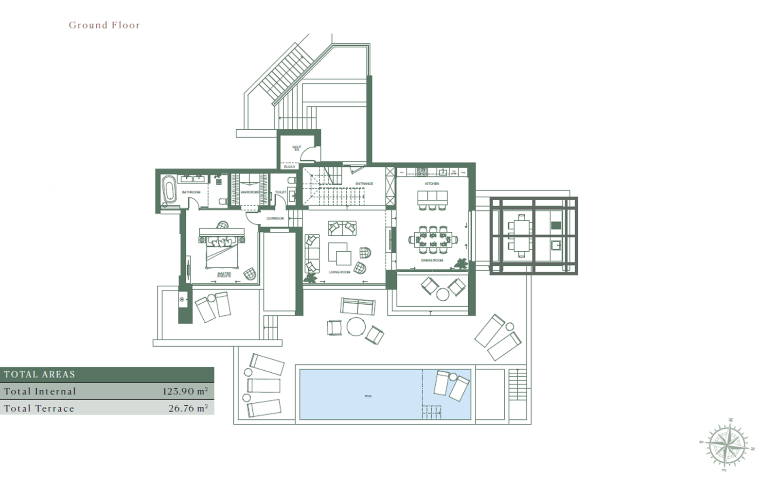The villa offers approximately 338 m² of total sellable area on a 1,175 m² private plot, thoughtfully designed across two levels with three bedrooms and 3.5 bathrooms. Interiors emphasize understated luxury: open-plan living and dining areas with fireplace, large terraces, premium international-brand kitchen with Miele appliances, underfloor heating, and elegant natural materials throughout. Outdoors, the property is anchored by a private swimming pool, stone-paved terraces, outdoor kitchen, al fresco dining area, and landscaped gardens—creating a true private retreat within a master-planned luxury environment.